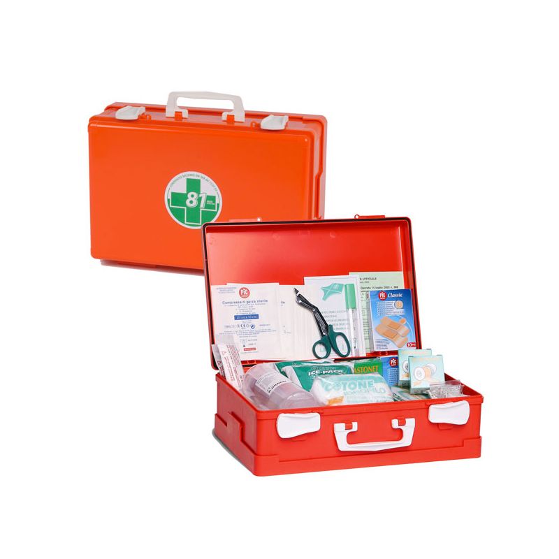 Valigetta colore arancio per aziende del gruppo A e B e comunque con tre o pi lavoratori, conforme al DM 388 del 15/07/2003 allegato 1 e D.L. 81 del 09/04/08 art.45. E un prodotto dotato di supporto per attacco a parete, maniglia per trasporto, guarnizione in neoprene e chiusura con due clip rotanti. Contenuto 1 Copia Decreto Min 388 del 15.07.03, 5 Paia guanti sterili, 1 Mascherina con visiera paraschizzi, 3 Flaconi soluzione fisiologica sterile 500 ml CE, 2 Flaconi disinfettante 500 ml IODOPOVIDONE al 10% iodio, 10 Buste garza compressa sterile 1010 cm, 2 Buste garza compressa sterile 1840 cm, 2 Teli sterili 4060 cm DIN 13152-BR, 2 Pinze sterili, 1 Confezione di cotone idrofilo, 1 Astuccio benda tubolare elastica, 2 PLASTOSAN 10 cerotti assortiti, 2 Rocchetti cerotto adesivo m 5 x 2,5 cm, 1 Paio di forbici tagliabendaggi cm 14,5 DIN 58279, 3 Lacci emostatici, 2 ICE PACK ghiaccio istantaneo, 2 Sacchetti per rifiuti sanitari minigrip, 1 Termometro clinico digitale CE, 1 Sfigmomanometro PERSONAL con fonendoscopio. Dimensione (L x P x H) 395x135x270 mm. Peso 6,20 kg