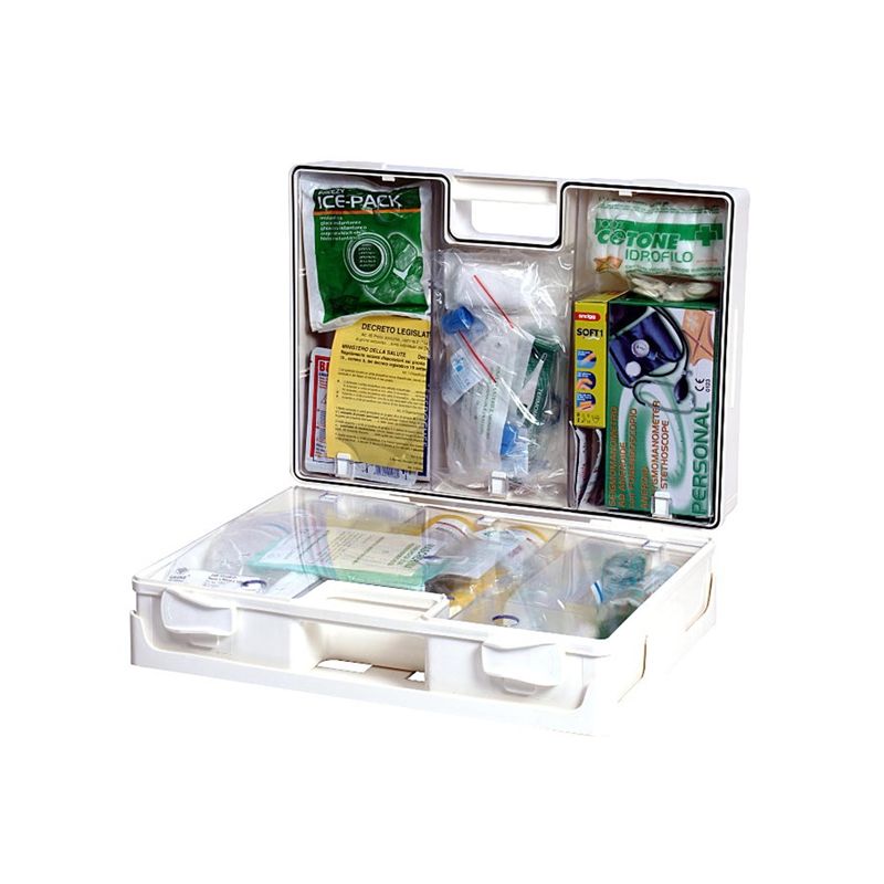 Valigetta in plastica colore bianco. Dotata di supporto per attacco a parete, maniglia per trasporto, guarnizione in neoprene, chiusura con due clip rotanti. Dimensioni 44,3x33,8x14,7cm. Contiene Kit reintegro All. 1 secondo DM 388 e DLGS 81 + maggiorazione - 1 Copia Decreto Min 388 del 15/07/03, - 5 Paia di guanti sterili, - 1 Mascherina con visiera para schizzi, - 1 Flaconi soluzione fisiologica sterile 500 ml CE, - 3 Flaconi disinfettante 500 ml iodopovidone al 10% iodio PMC, - 10 buste di garza sterile compressa 10x10 cm, - 2 Buste di garza sterile compressa 18x40 cm, - 2 Teli sterili cm 40x60 DIN 13152-BR, - 2 Pinze sterili, - 1 Confezione di cotone idrofilo, - 1 Astuccio benda tubolare elastica, - 2 Confezioni da 10 cerotti assortiti, - 2 Rocchetti cerotto adesivo m 5x2,5 cm, - 1 Paio di forbici taglia bendaggi 14,5 cm DIN, - 3 Lacci emostatici, - 2 Ice pack ghiaccio istantaneo, - 2 Sacchetti per rifiuti sanitari, - 1 Termometro clinico, - 1 Sfigmomanometro Personal con fonendoscopio, Maggiorazione - 1 Plastonet benda tubolare 2 misure, - 1 Guanti nitrile paio sterili large, - 1 Benda m 3,5x10cm cellophane orlata, - 1 Tampobenda 80x100 sterile M, - 1 Tampobenda 100x120 sterile G, - 2 Telo triangolare TNT, - 12 Spilla di sicurezza calibro 1 38 mm - 1 Benda emocontrol antiemorragica, - 1 Tappo soluzione lavaggio oculare, - 10 ditali in lattice mis L, - 1 Astuccio 10 cerotti assortiti, - 1 astuccio cerotti assortiti blu detectable, - 10 Preparato 3,5 g gel per ustioni sterile, - 2 Garza 10x10 cm per ustioni sterile, - 2 Vento per rianimazione bocca bocca, - 1 Soft Next 6x100 cm blu bendaggio adesivo.