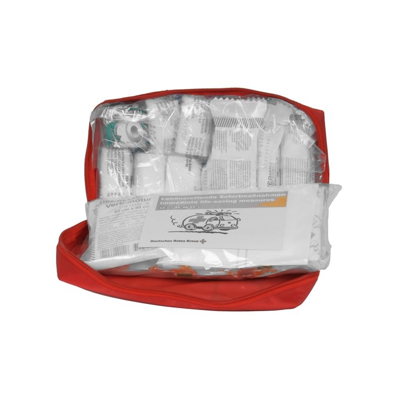Borsetta in nylon antistrappo e con chiusura a cerniera. Contenuto conforme a quanto previsto dalla norma DIN 13164. Obbligatorio come dotazione su automezzi di trasporto in alcune nazioni europee. Contenuto 1 rotolo cerotto m 5x2,5 cm 2 bende di garza cm 6x4 m 3 bende di garza cm 8x4 m 1 paio di forbici tagliabendaggi 1 conf. da 4 guanti in vinile 1 telo sterile TNT 60x80 cm 1 teli sterili TNT 60x40 cm 2 tampobende sterili 80x100mm 1 tampobenda sterile 100x120 mm 1 tampobenda sterile 60x80 mm 3 compresse sterili 10x10 cm 2 teli triangolari TNT 96x96x136 cm 1 coperta isotermica 2 salviettine alcool 70% 1 confezione 14 cerotti assortiti.