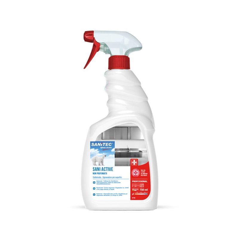 Sgrassatore battericida universale, pronto alluso. La sua formulazione studiata per disinfettare e sgrassare a fondo, anche in presenza di sporco ostinato, tutte le superfici. PRESIDIO MEDICO CHIRURGICO Registrazione del Ministero della Salute n. 20440. Sgrassa e rimuove germi e batteri da tutte le superfici in cucina, bagno, uffici, ambienti pubblici, auto e contenitori di raccolta rifiuti. Consigliato anche per il settore agroalimentare e sanitario, su superfici a contatto alimentare, e per quelle a contatto con persone anziane e bambini. Ideale in tutti casi in cui si necessita di pulizia e disinfezione in ununica operazione. Per la normale pulizia spruzzare direttamente sulla superficie da trattare e quindi asciugare con un panno o carta. Per la disinfezione spruzzare e lasciare agire per almeno 15 minuti, quindi asciugare con un panno, carta o risciacquare. Pronto alluso.