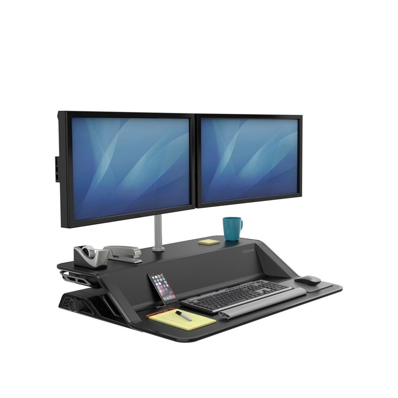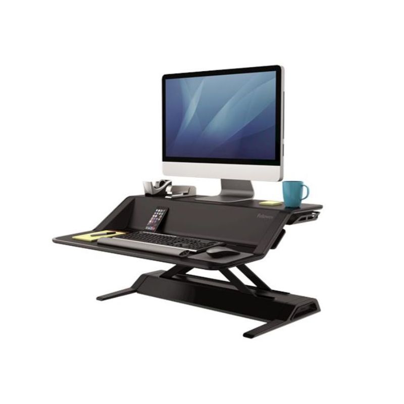 Le postazioni di lavoro di ultimissima generazione Sit-Stand Lotus di Fellowes aggiungono movimento alla tua giornata e ti aiutano a lavorare e stare meglio senza sforzi. La postazione Sit-Stand Lotus si appoggia alla scrivania e pu essere sollevata facilmente fino a 43 cm tramite due comode maniglie ergonomiche che permettono di lavorare sia seduto che in piedi. Laltezza regolabile in 22 posizioni mantenendo una perfetta stabilit e sorreggendo un peso fino a 15,8 kg. Lampia superficie di lavoro consente di organizzarsi al meglio mantenendo tutti gli strumenti essenziali per la scrivania compresa tastiera e mouse che pu essere posizionato a destra o a sinistra. La postazione dotata di un sistema ordinacavi e di aree per contenere e ricaricare i dispositivi elettronici. Il prodotto viene consegnato gi assemblato per una facile installazione, dove tramite lausilio di un supporto esterno sar possibile montare un braccio singolo e doppio.