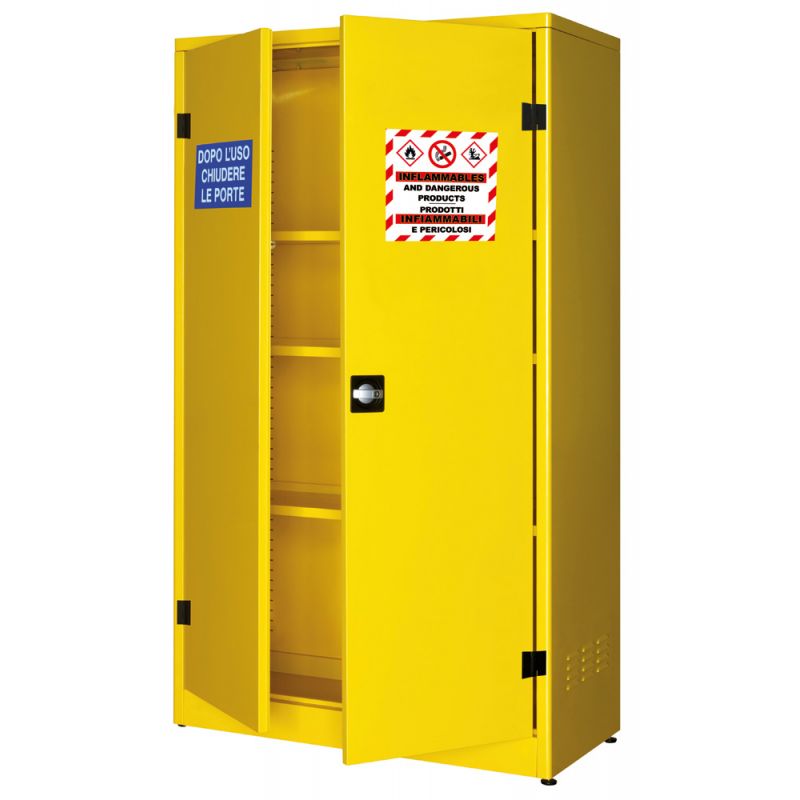 Armadi di sicurezza componibili per lo stoccaggio di liquidi infiammabili, realizzati in lamiera di acciaio al carbonio P02 spessore 10/10. Colore GIALLO RAL 1021. Dotati di ripiani di contenimento regolabili in altezza e vasca di raccolta a tenuta stagna sul fondo, n. 2 griglie di areazione laterali e una posizionata sul tetto con sistema tagliafiamma appositamente studiate per il ricircolo dellaria o per laspirazione forzata. Spigolo arrotondato, robuste cerniere in zama spessore 6 mm, cavo di messa a terra, piedini regolabili, serratura ergonomica in plastica e alluminio con doppia chiave completa di chiusura ad asta con carter copriaste antimanomissione.