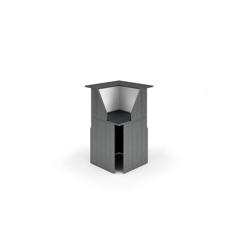Modulo angolare 90 Dimensioni totali L76,1 x P76,1 x H117cm. Sopralzo prof. 30cm. Desktop prof. 60cm. I banconi sono tutti autoportanti, compreso il modulo ad angolo 90 (reversibile destro/sinistro), e permettono l allestimento di postazioni di lavoro personalizzate secondo le esigenze e lo spazio a disposizione. Gli elementi si integrano fra loro creando soluzioni flessibili e funzionali, per cui la reception non connota pi una barriera, ma unarea di accoglienza, grazie anche allo speciale modulo per portatori di disabilit privo di sopralzo. Disegnata pensando allutilizzatore moderno, i banconi sono completi di fori passacavi ed i sopralzi sono posti ad unaltezza di 117 cm, in modo da permettere il posizionamento di numerosi modelli di monitor di ultima generazione, anche di dimensioni generose, al di sotto di questultimi. Ogni modulo completo di separatori laterali (prof. 35 cm, sp. 18 mm) per garantire privacy ed isolamento acustico. Dotata di piedini regolabili in altezza. In materiale nobilitato bilaminato melaminico (sp. 18 e 22 mm) a bassa emissione di formaldeide, conforme alle norme UNI e EN classe E1. Finiture antigraffio e antiriflesso.