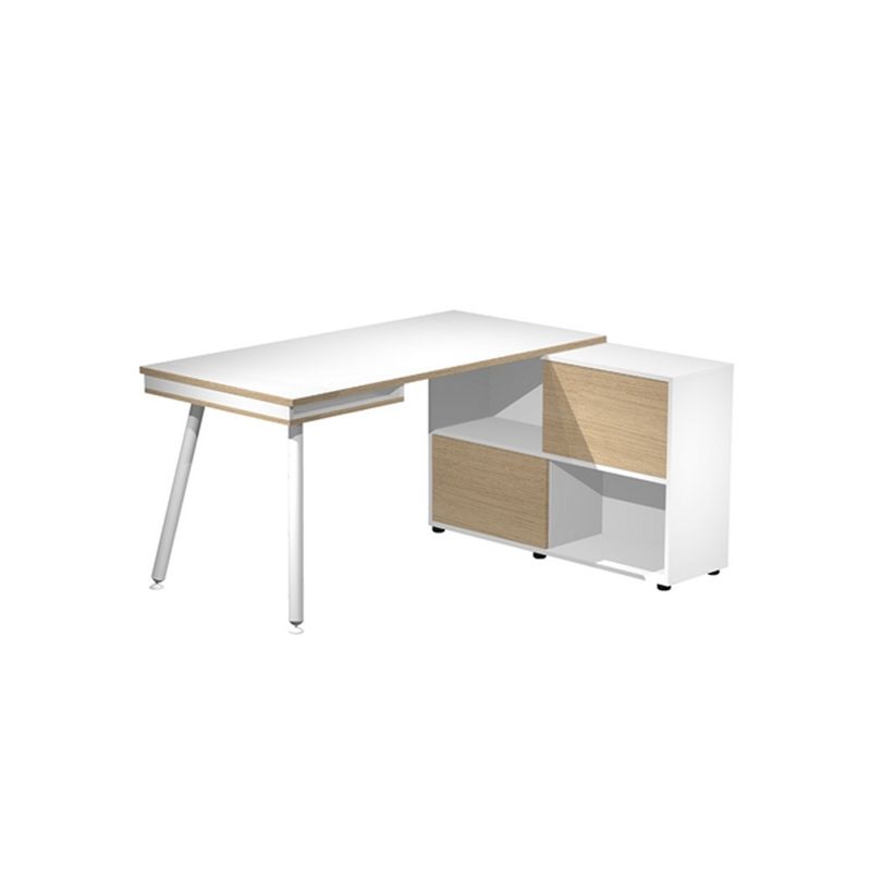 Postazione di lavoro compatta, ideale per lhome-office, con design e finiture di ispirazione scandinava. Lampio piano di lavoro sorretto da un lato da un pratico mobile di servizio portante a quattro vani completo di due ante scorrevoli e piedini regolabili in altezza e dallaltro da una coppia di gambe in metallo o da una coppia di gambe in legno massello, entrambi con piedini livellabili in altezza. Contenitore portante reversibile sx/dx sotto il desktop in corrispondenza delle gambe (aperta su due lati), dimensioni cm 120x35x79H, dotata di due ante scorrevoli in color rovere. Materiale bilaminato nobilitato melaminico spessore conforme norme UNI e EN classe E1, antigraffio ed antiriflesso.