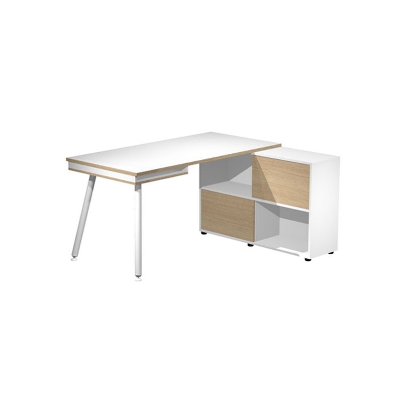 Postazione di lavoro compatta, ideale per lhome-office, con design e finiture di ispirazione scandinava. Lampio piano di lavoro sorretto da un lato da un pratico mobile di servizio portante a quattro vani completo di due ante scorrevoli e piedini regolabili in altezza e dallaltro da una coppia di gambe in metallo o da una coppia di gambe in legno massello, entrambi con piedini livellabili in altezza. Contenitore portante reversibile sx/dx sotto il desktop in corrispondenza delle gambe (aperta su due lati), dimensioni cm 120x35x79H, dotata di due ante scorrevoli in color rovere. Materiale bilaminato nobilitato melaminico spessore conforme norme UNI e EN classe E1, antigraffio ed antiriflesso.